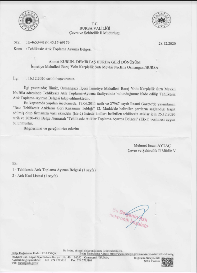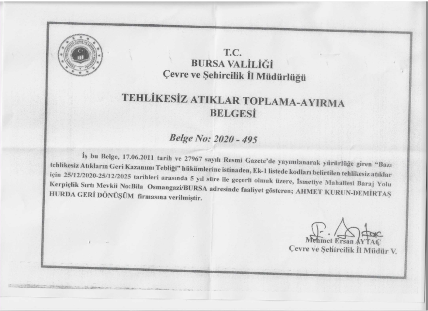 Ahmet Kurun Demirtaş Hurda Geri Dönüşüm olarak geri kazanılabilir atıkların toplanması, ayrıştırılması ve geri kazanımı konularında yerel yönetimler ve sanayi kuruluşları ile çalışmalar yürütmektedir. Şirketimiz, yoğunlukla Bursa İli ve çevresinde bulunan sanayi kuruluşları ile birlikte, 2001 yılından beri geri dönüşüm faaliyetlerini sürdürmektedir.